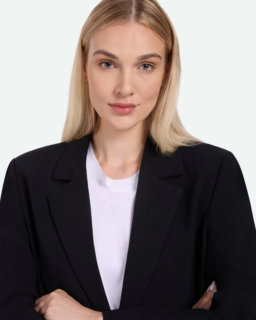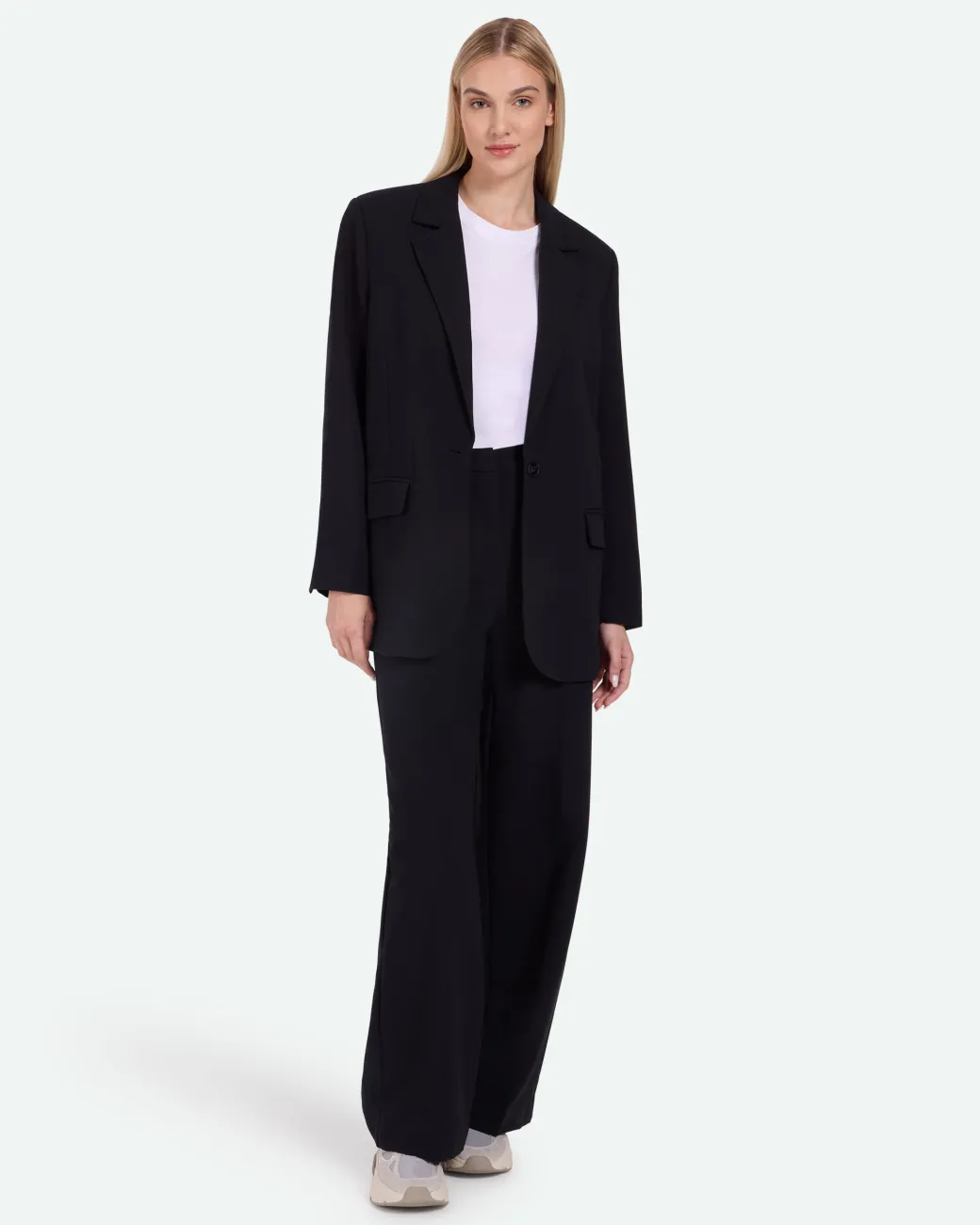 Novi is a modern classic blazer with tailored look and is crafted from 79% recycle polyester, 17% viscose and 4% elastane. The blazer has a slightly oversized fit and features shoulder pads and a minimalistic lapel collar. It is detailed with a single button, pockets and a slit at back. The model is 180 cm tall and wears a size 36.