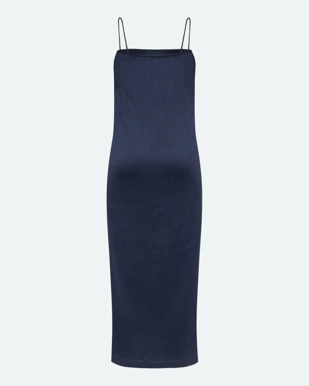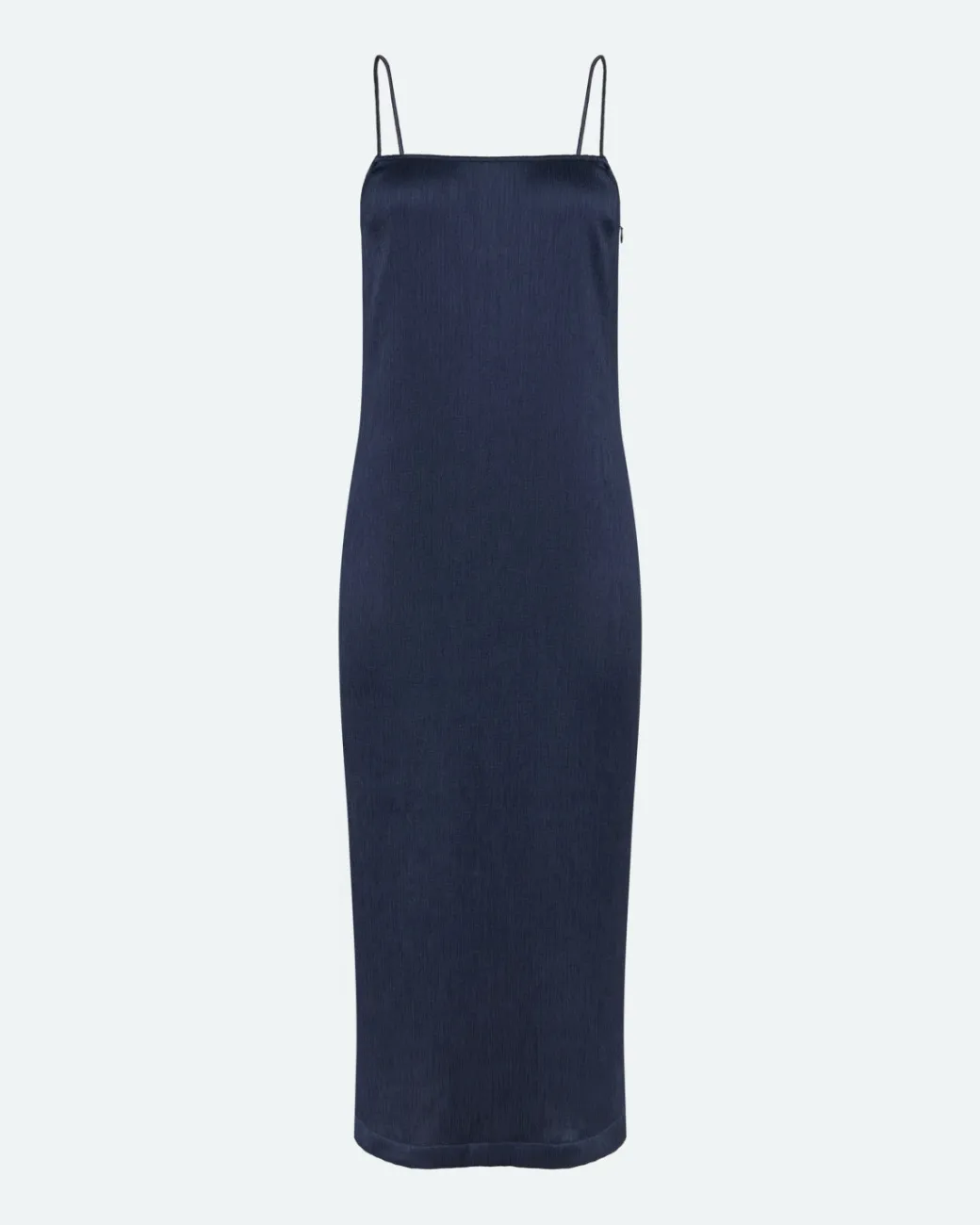 Make room for timeless elegance in your wardrobe with this fitted midi dress. Designed with thin shoulder straps and made from a satin-like material, our Mia dress combines simplicity and refined style. The beautiful dark blue color makes it perfect for both everyday and festive occasions.The dress has a flattering fitted fit that accentuates the silhouette in a sophisticated way. The thin shoulder straps add a subtle, feminine elegance, while the midi-length cut gives a modern and stylish look.Made from satin-like polyester, the dress feels light and soft against the skin, while having a slight sheen that gives a luxurious expression. The material is easy to care for and maintains its fit and beautiful finish all day long.The deep dark blue color is both timeless and versatile. Style the dress with heels and a small clutch for a festive look, or add sneakers and an oversized blazer for a modern and casual style.This dress is the definition of minimalist elegance. With its simple yet refined design and luxurious material, it is a versatile addition to any wardrobe. Whether you are going to a dinner, a party or just want to feel extra comfortable, this dress is a perfect choice.