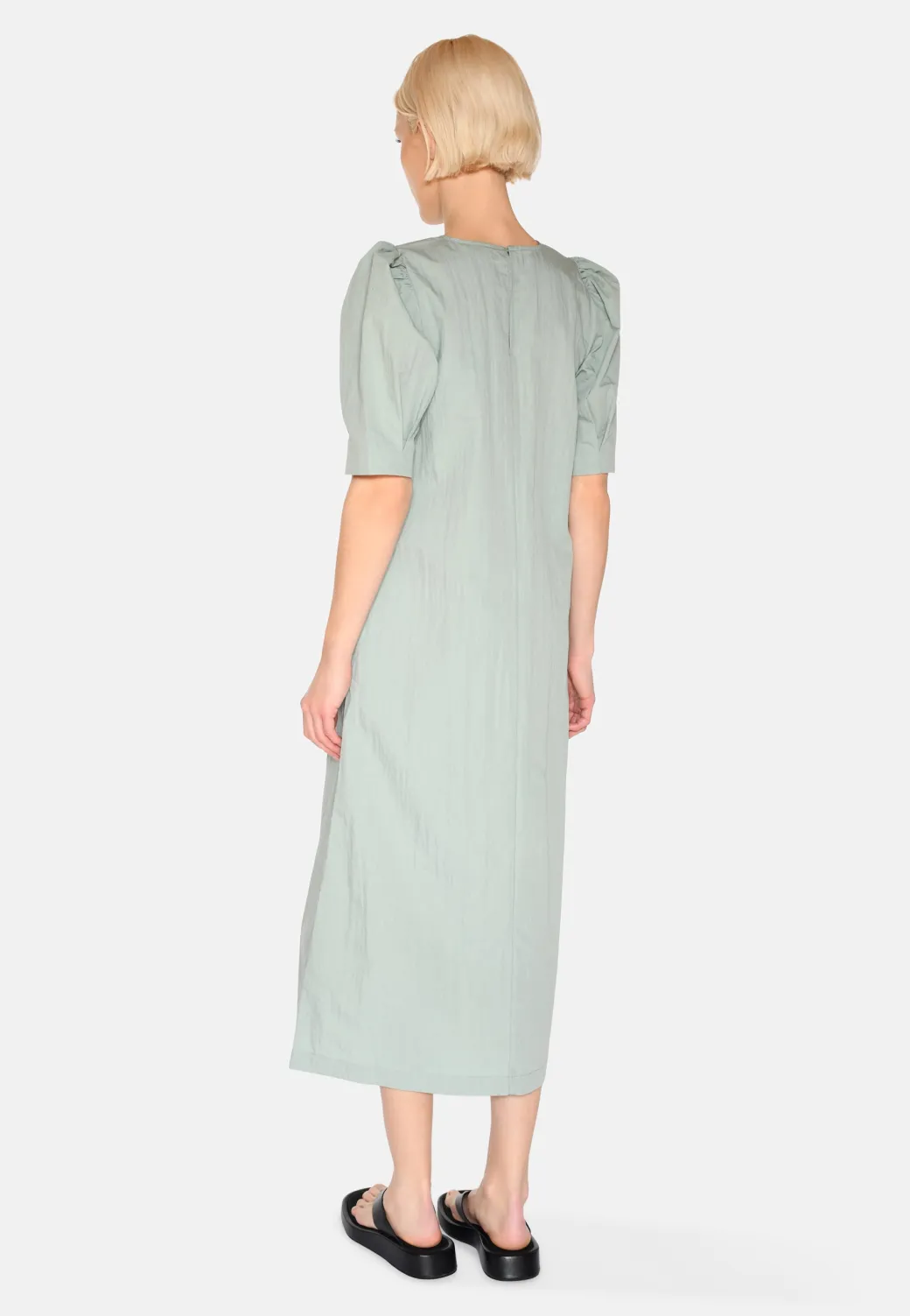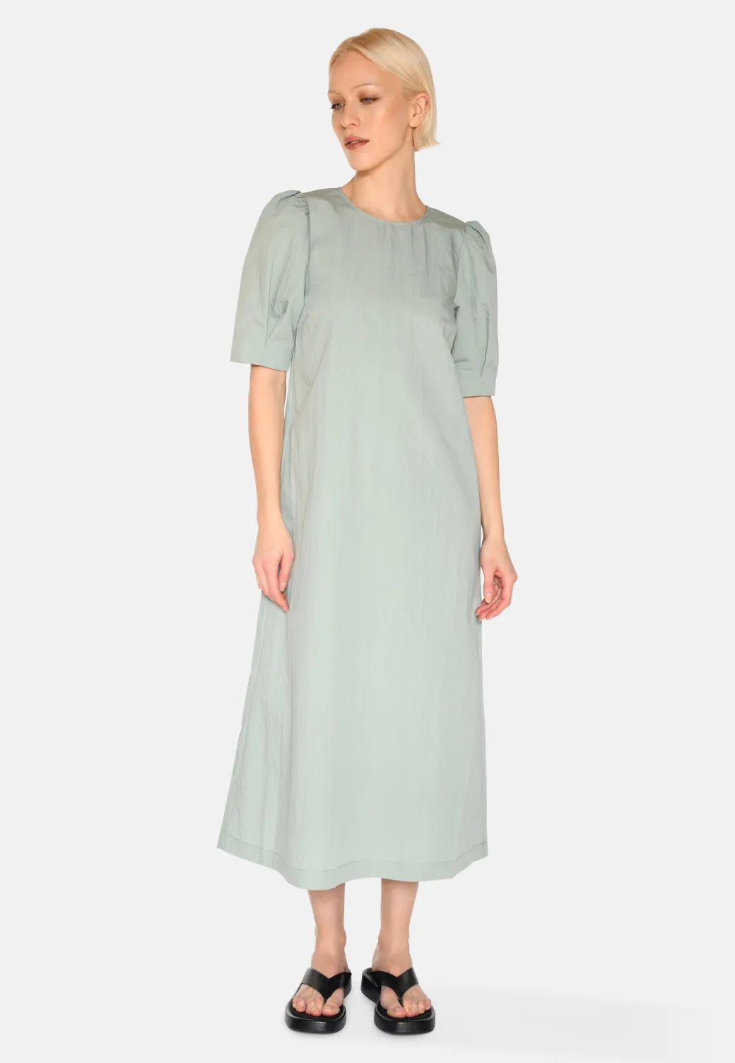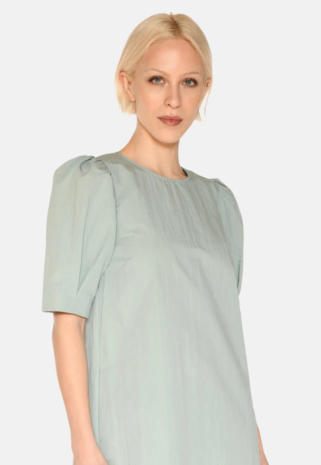 Highlight your feminine side with our Vayas midi dress, which combines classic elegance with modern comfort. Made from a lightweight blend of cotton and nylon, which gives the dress a soft yet structured quality that falls beautifully around the body.The dress is designed with slightly puffed sleeves that add delicate volume and create a subtle silhouette. The hidden side pockets provide a practical element, while the knee-length design makes it perfect for both everyday and more formal occasions. A simple round neckline and a straight, relaxed fit complete the look, so you can feel stylish without compromising on comfort.A dress that combines Scandinavian simplicity with a touch of romance – perfect for any occasion.