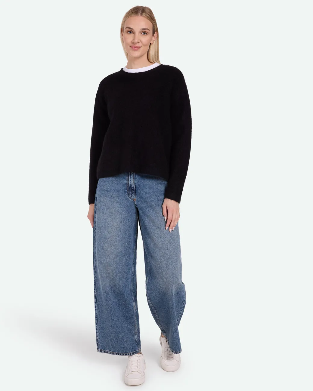 Calaha is a classy feminine knit crafted from a mix of 33% mohair, 33% wool, 30% nylon and 4% elastane for a soft, warm and stretchy quality. The knit has a regular fit and features dropped shoulders, crew neck and a rib quality.