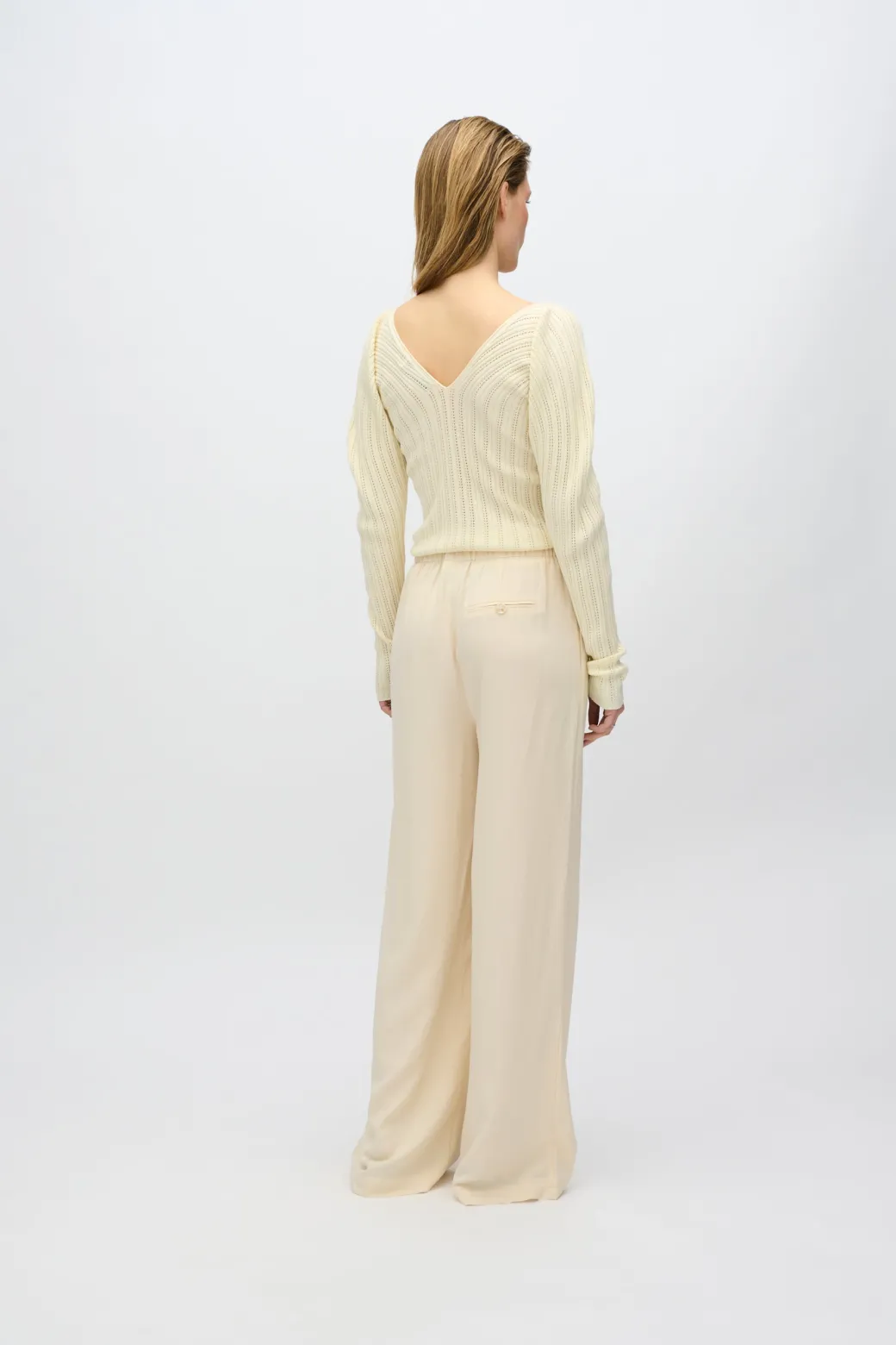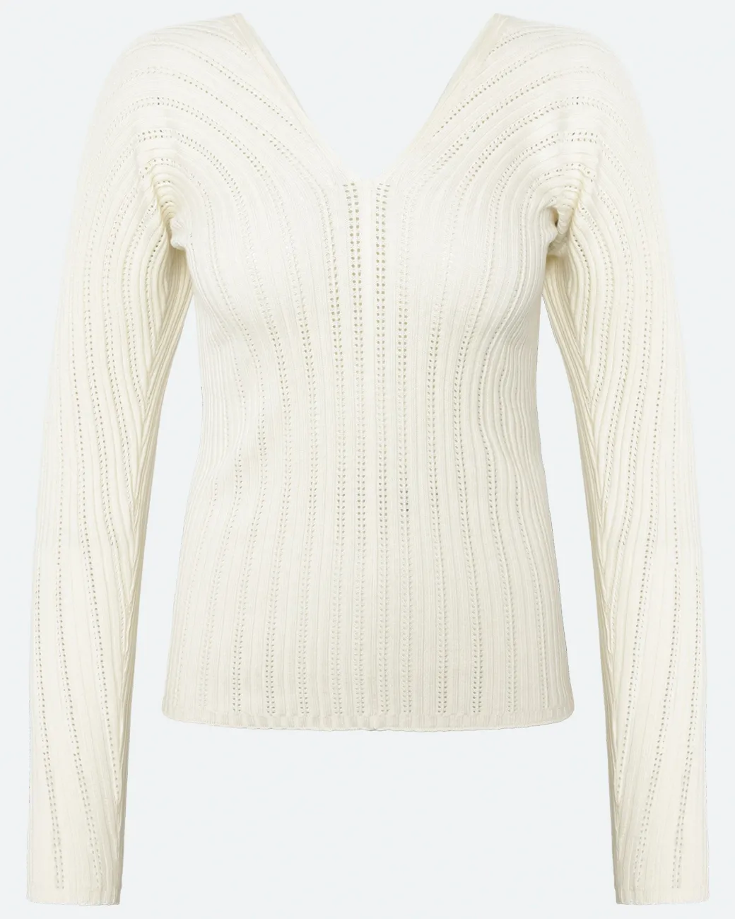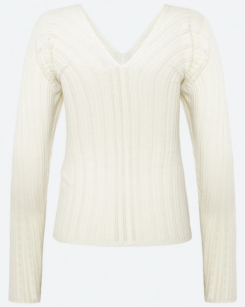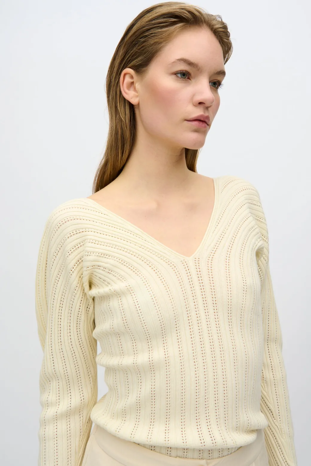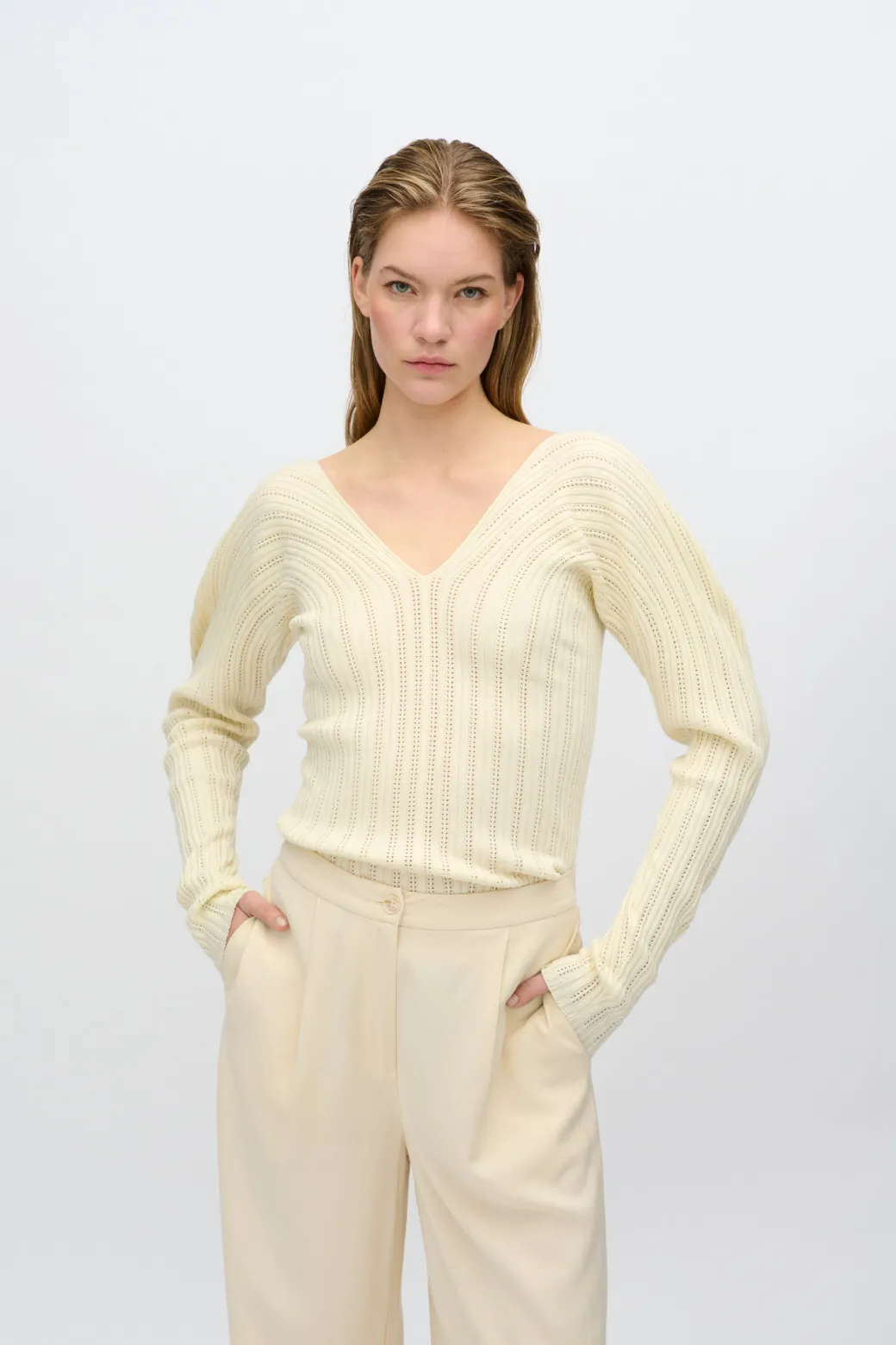 Experience timeless elegance and ultimate comfort with our Sofia knit sweater, made from a soft and breathable blend of viscose and cotton. The material ensures a light and comfortable feel, while the tight fit flatters your silhouette.The sweater is designed with a deep V-neck, adding a feminine and sophisticated touch, perfect for both everyday wear and more elegant occasions. The long sleeves make it ideal for layering or as a stylish statement piece on its own.Style the Sofia knit sweater with high-waisted jeans for a casual look, or combine it with a skirt and jewelry for a more sophisticated style.