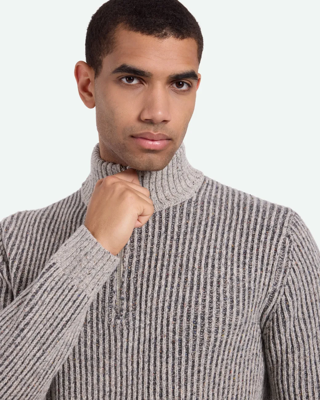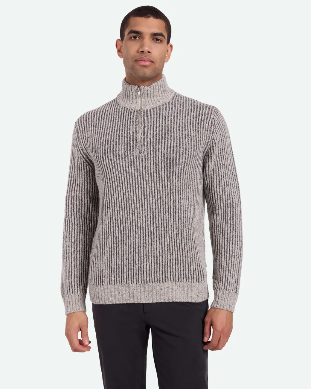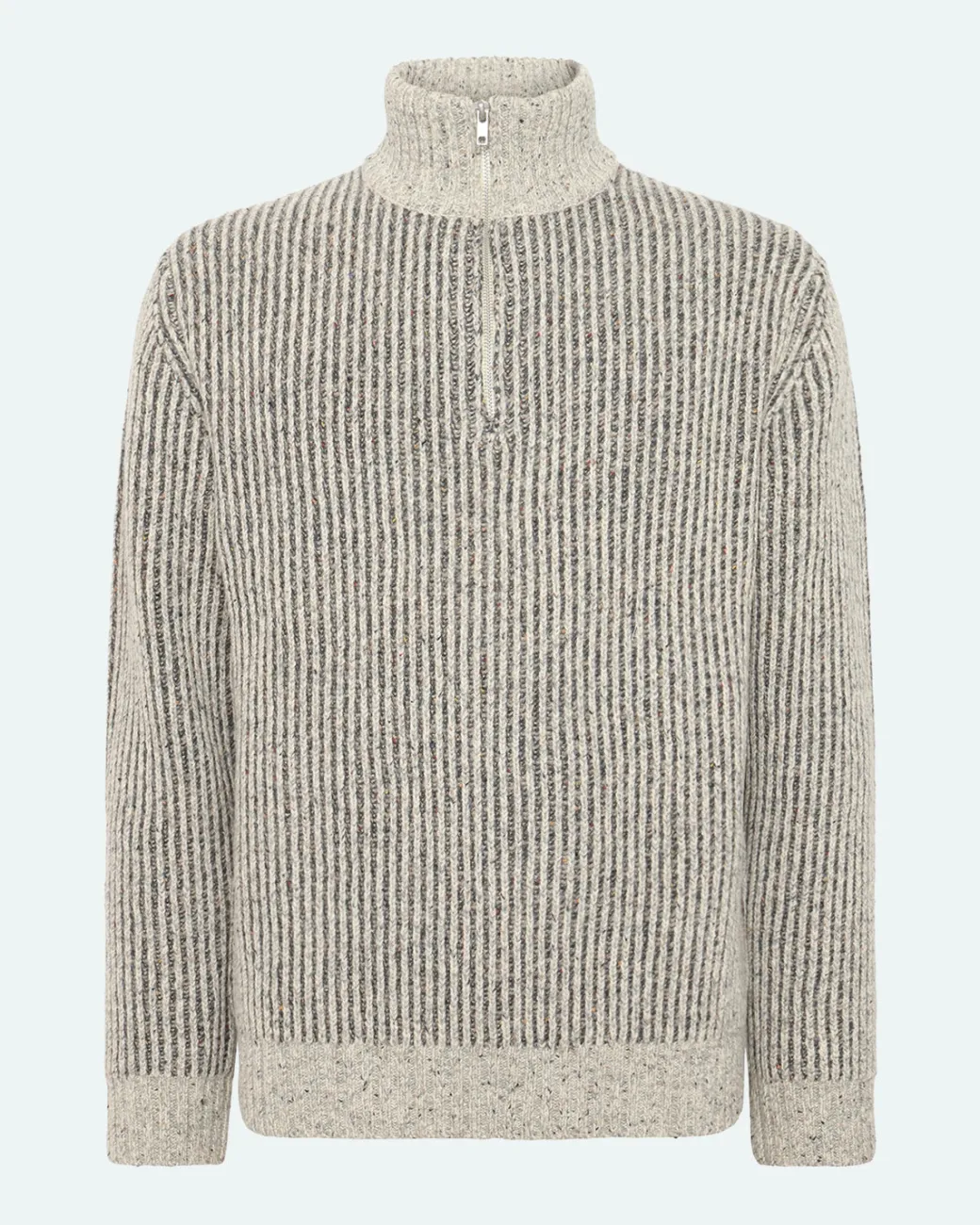 Delix is a heavy knitted half-zip jumper made from 80% lambswool and 20% nylon for a warm and comfortable quality. The knit jumper has a regular fit and is designed in a nice gray melange material with a high neck, ribbed edges and zip closure. The model is 188 cm tall and wears a size large.