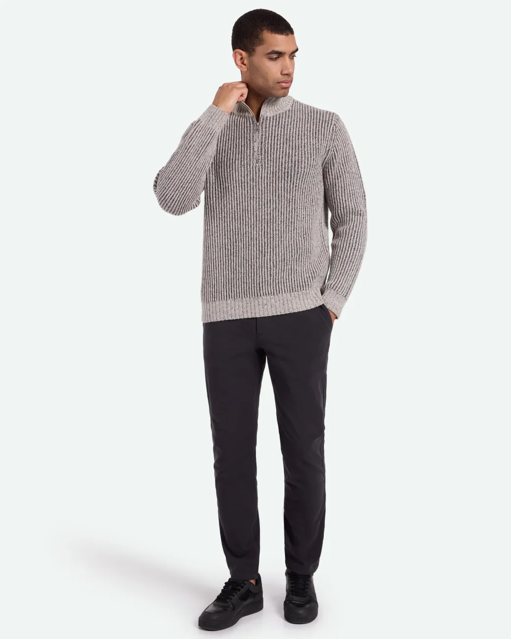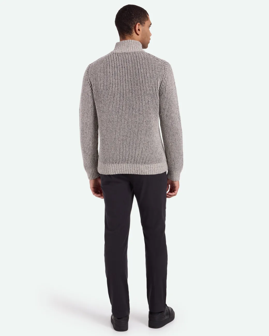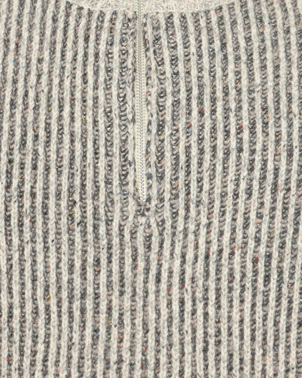 Delix is a heavy knitted half-zip jumper made from 80% lambswool and 20% nylon for a warm and comfortable quality. The knit jumper has a regular fit and is designed in a nice gray melange material with a high neck, ribbed edges and zip closure. The model is 188 cm tall and wears a size large.