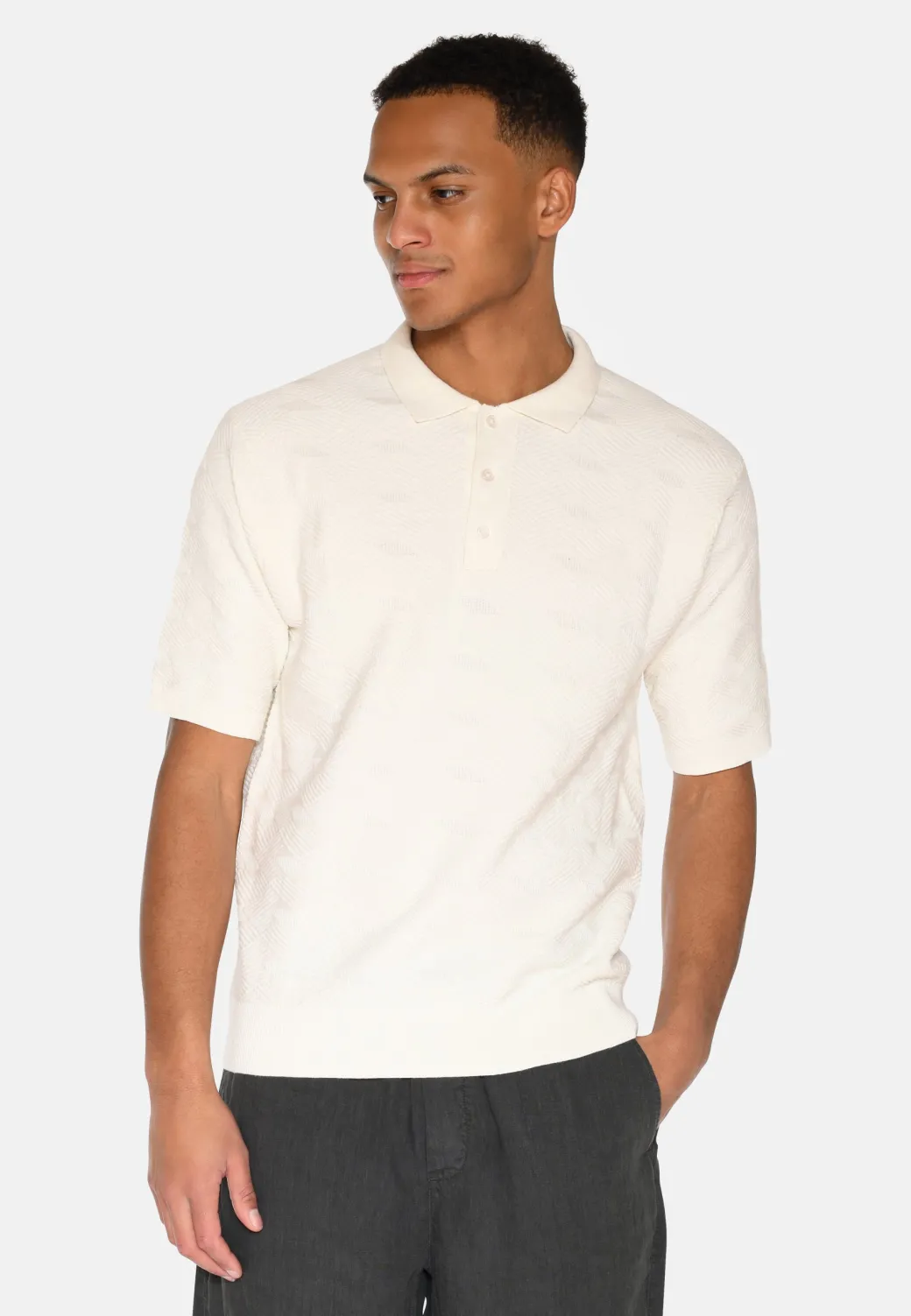 This short-sleeved polo shirt is made from 100% organic cotton and offers both comfort and style in a classic design. The structured pattern gives a subtle yet elegant look that makes the shirt both versatile and modern.The shirt is detailed with a classic polo collar, a discreet button closure and ribbed edges, which together create a sharp and stylish silhouette. The relaxed fit makes it ideal for both casual and more dressed-up looks, and it is perfect for warmer days when you still want to look well-dressed.Wear it with a pair of jeans or chinos for a timeless and sophisticated outfit that is suitable for both everyday and weekend wear.