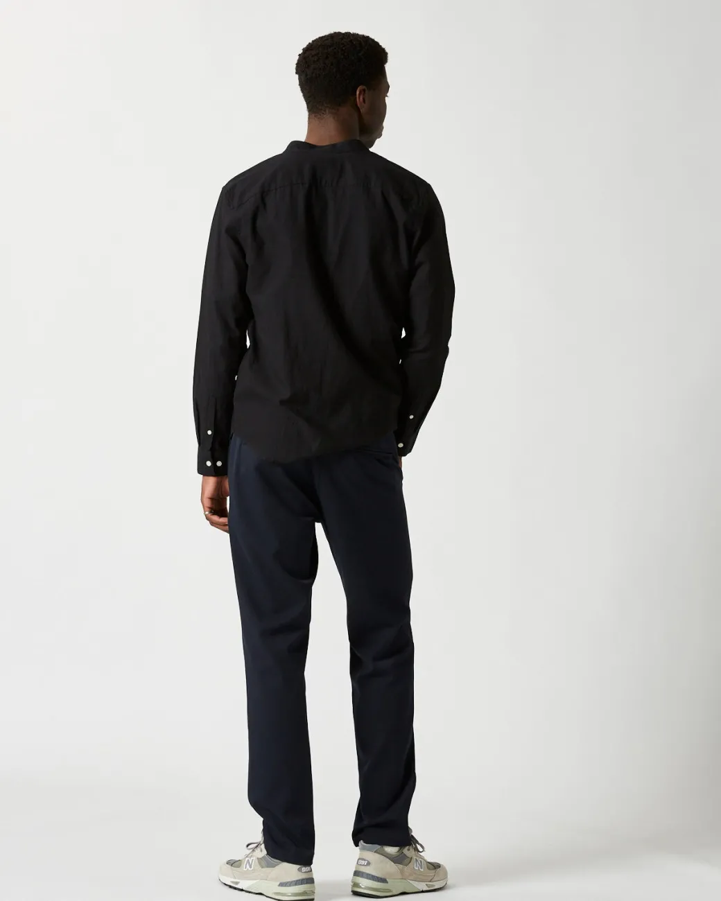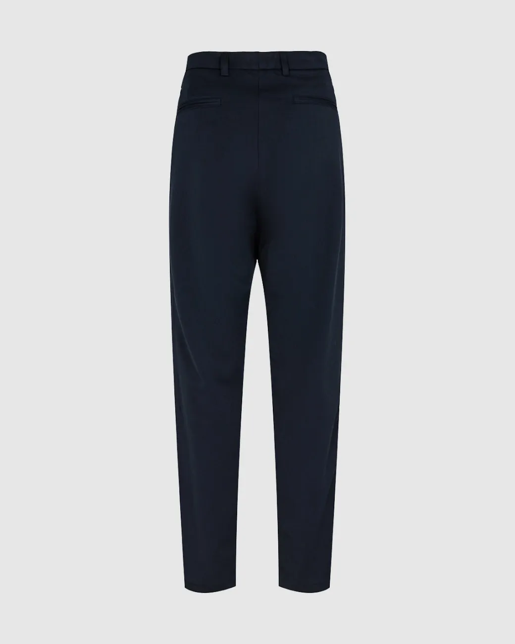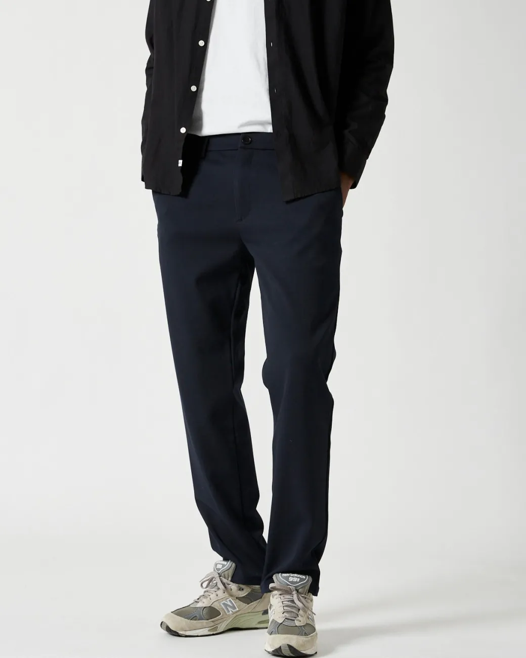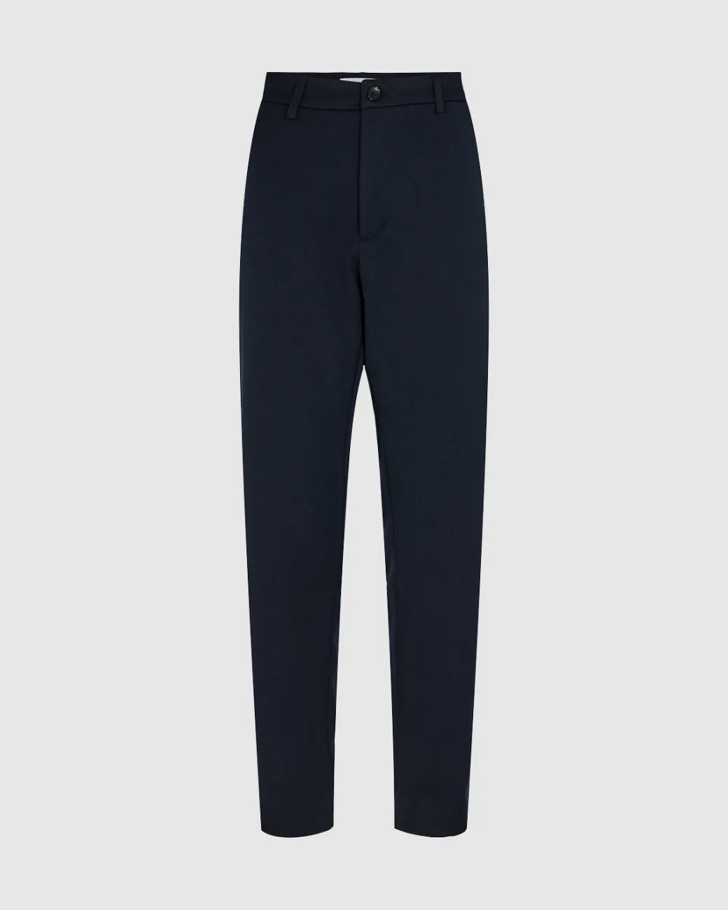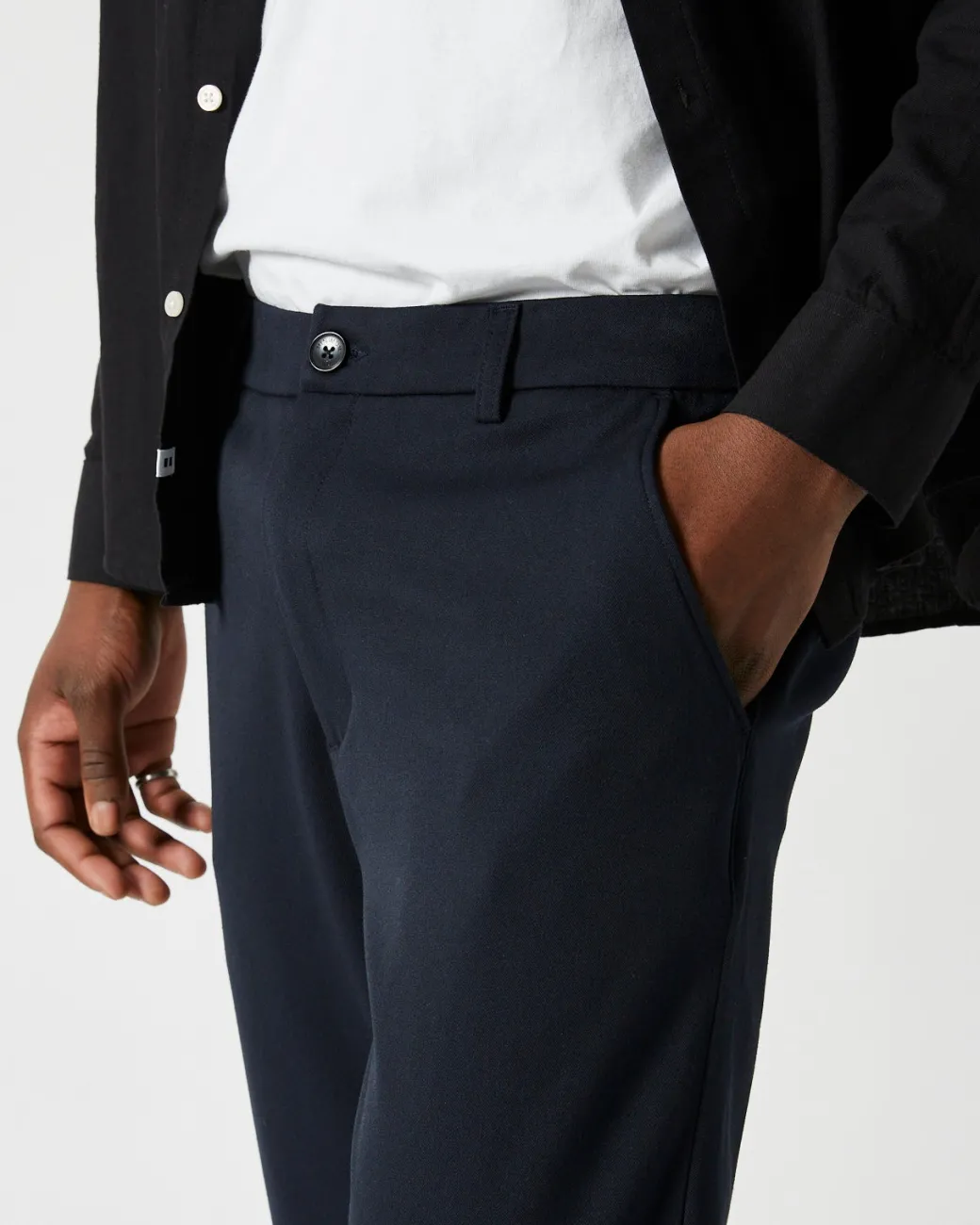 Sofus 9780 is a pair of cool chino pants crafted from recycled polyester, viscose and elastane for a soft and stretchy quality. The pants have a regular fit with straight legs, that are more narrow at the bottom. They feature button and zipper closure, belt straps, slanted side pockets and welt pockets at the back. The model is 193 cm tall and wears a size 32.