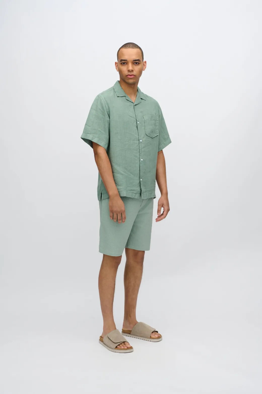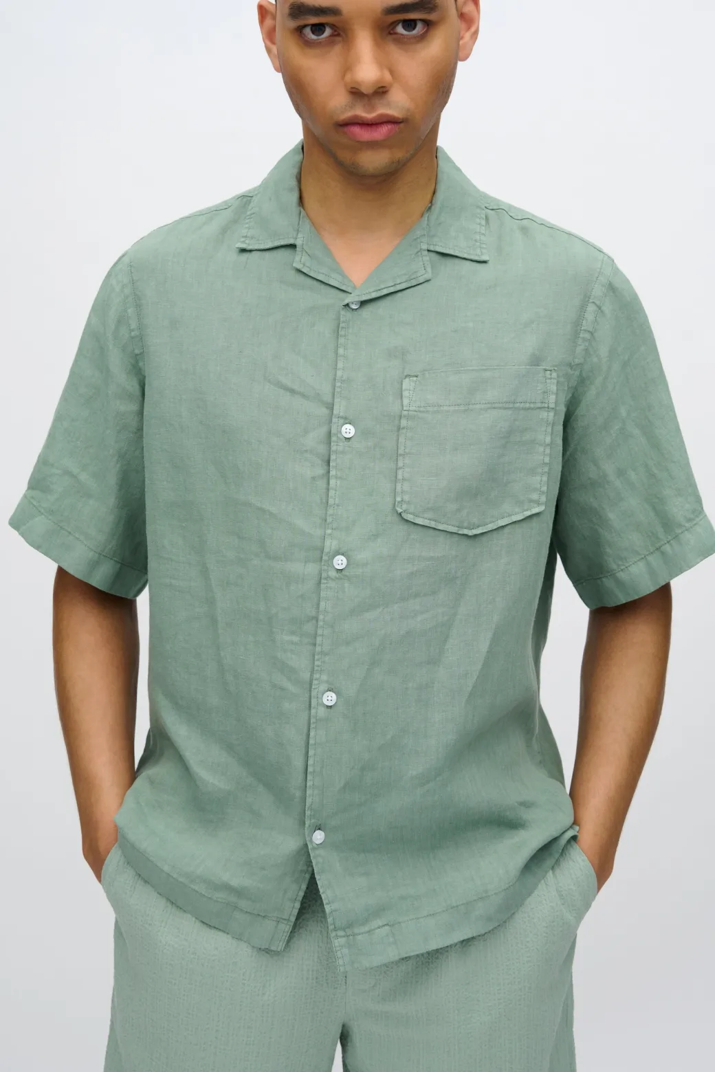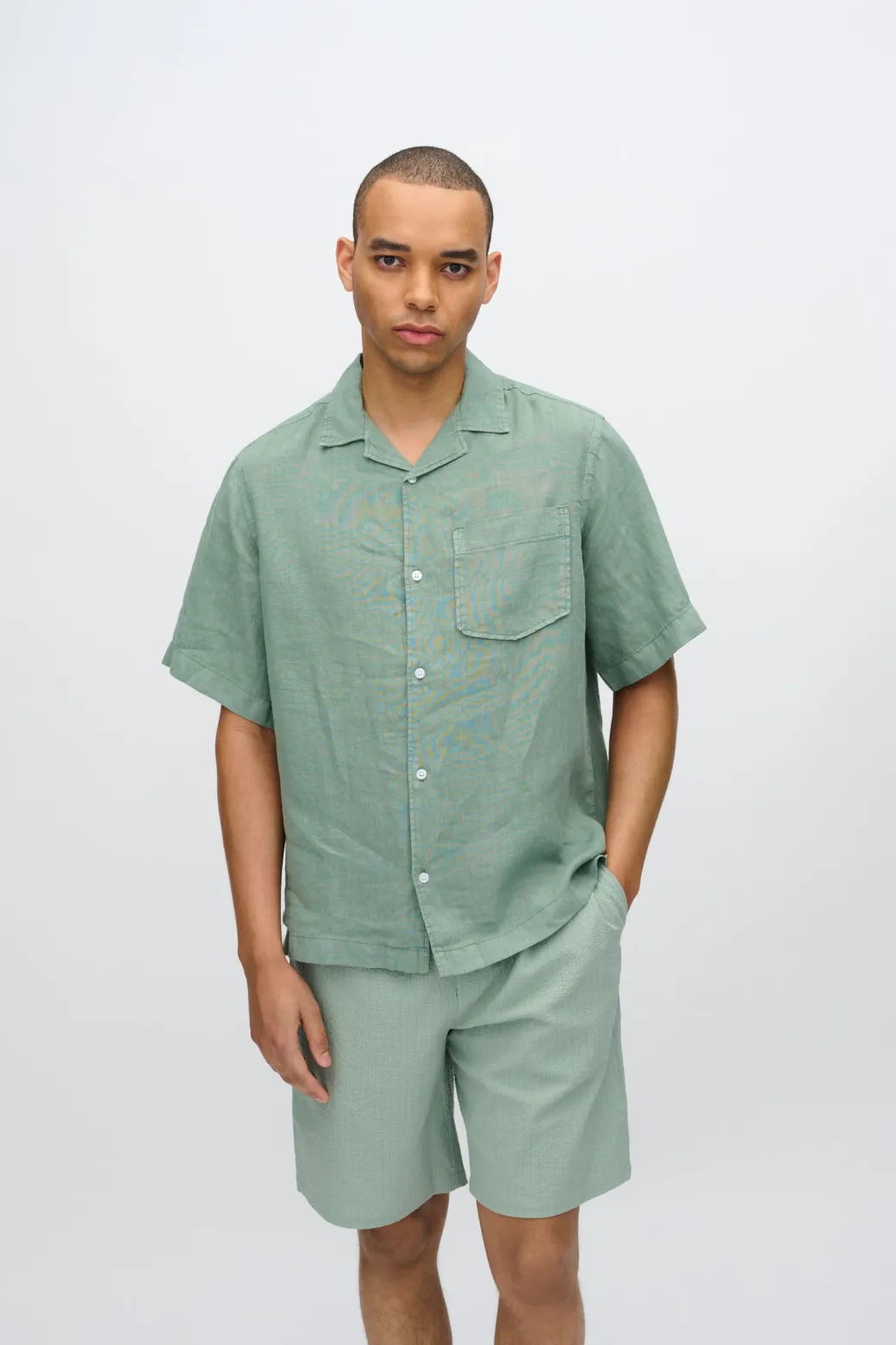 This short-sleeved linen shirt is made from 100% linen, making it both lightweight and breathable – perfect for warmer days. The shirt has a relaxed fit, which provides good freedom of movement and comfort all day long. The classic collar and the continuous button closure give the shirt a stylish and timeless expression, while a single chest pocket adds both functionality and a discreet design element.The linen shirt is a versatile choice that can be styled for both relaxed and more semi-formal occasions. It is ideal for a day at the beach, as a light shirt over a t-shirt or as part of a casual outfit for both weekdays and weekends.
