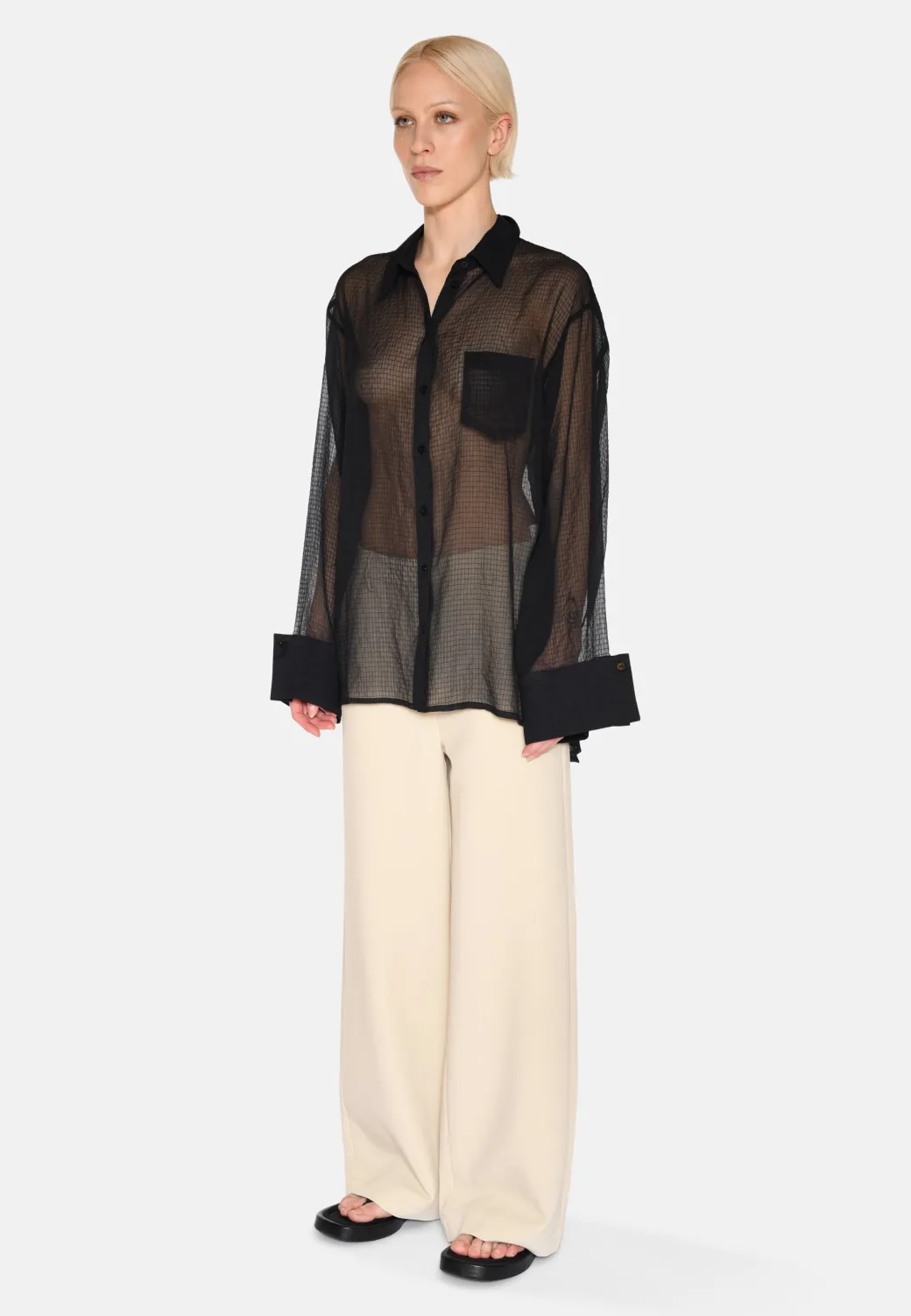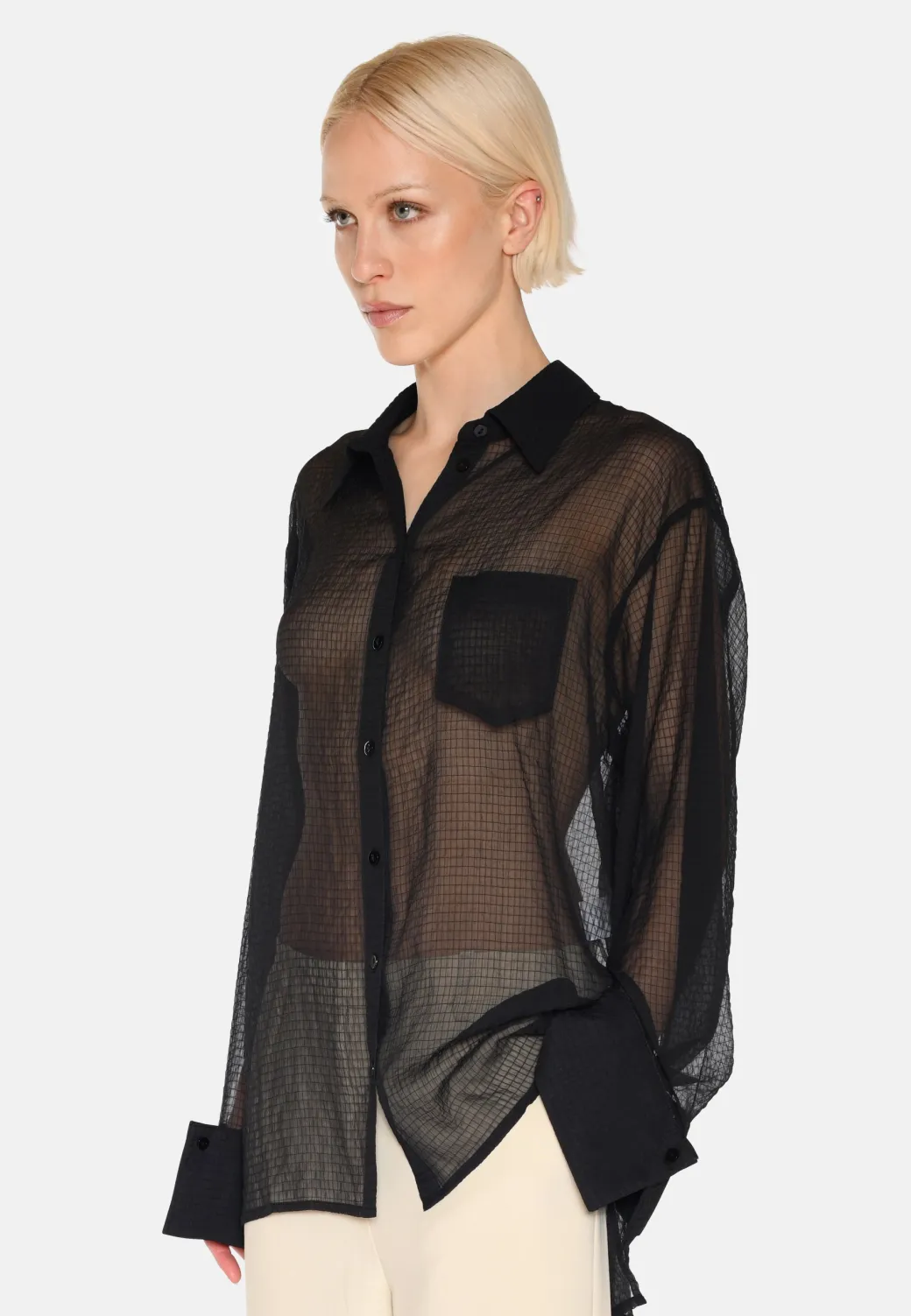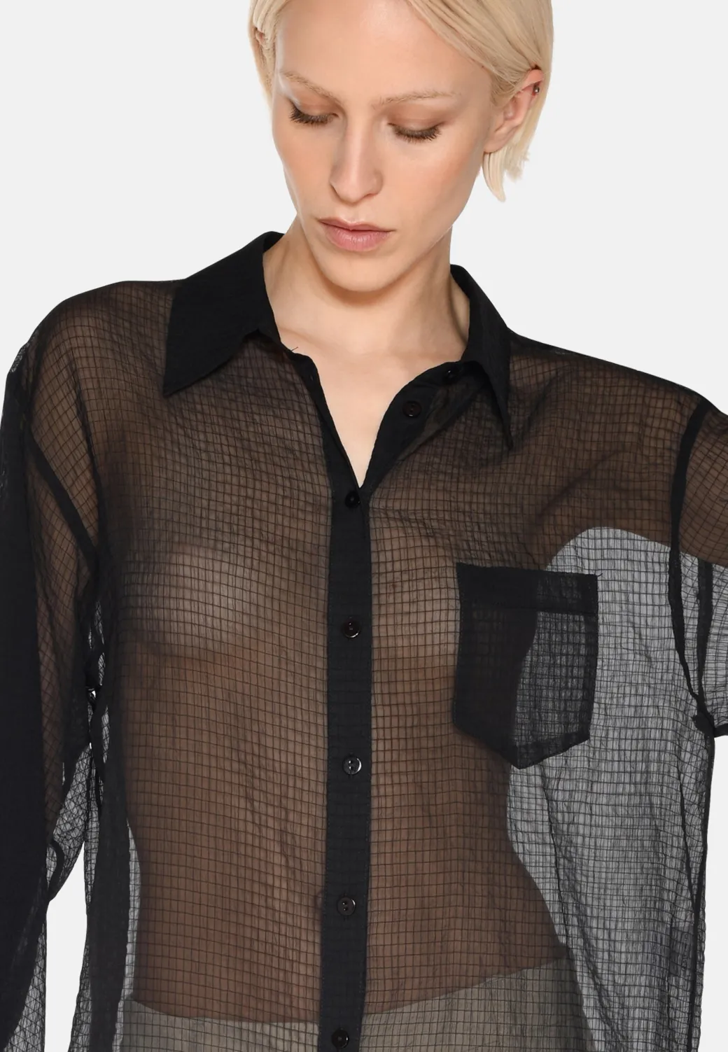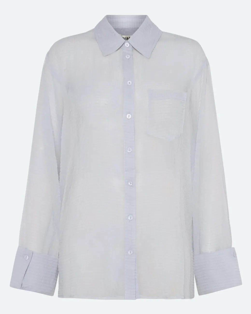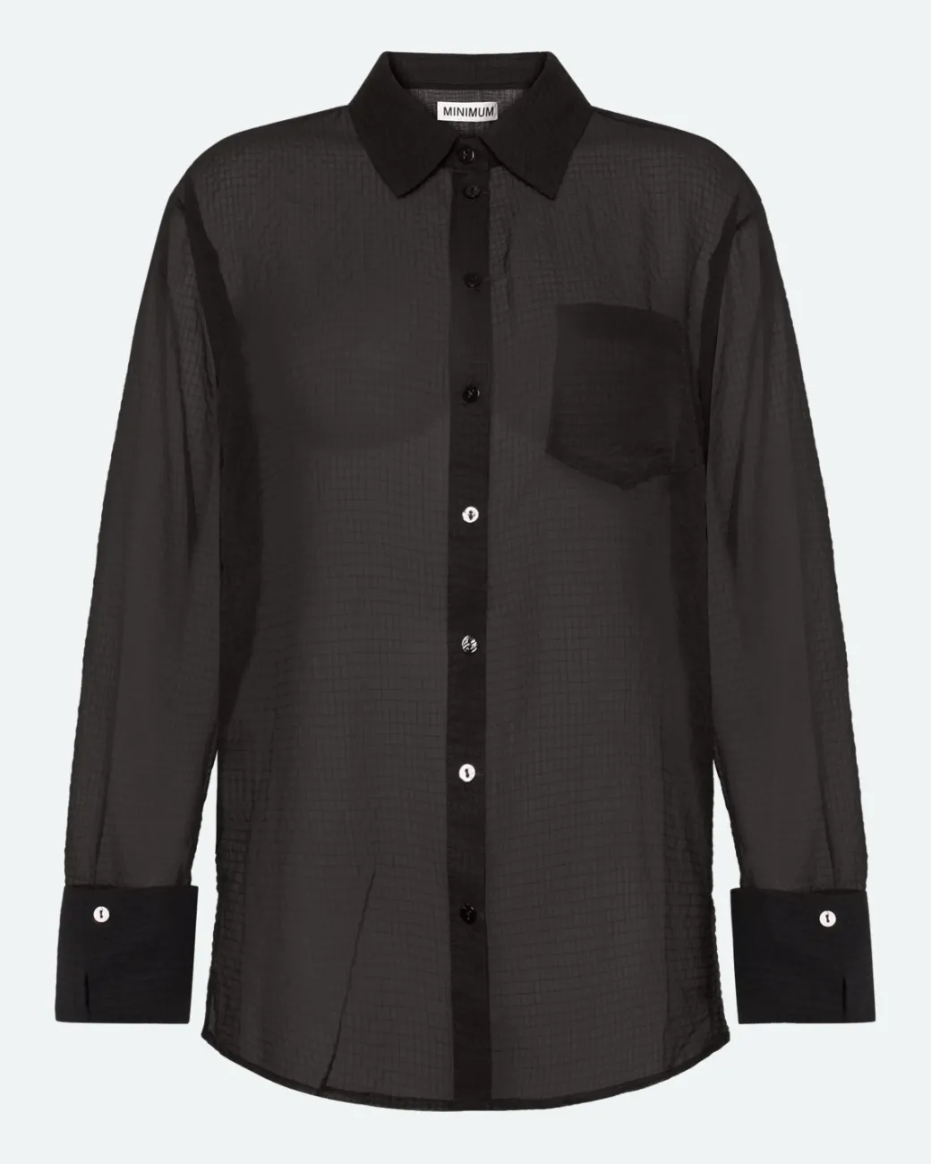 Add a feminine and elegant touch to your wardrobe with our long-sleeved Pina shirt in 100% recycled polyester. With a classic cut, a single chest pocket and a slightly sheer design, this shirt combines timeless aesthetics with a modern, eco-conscious approach.The shirt has a classic cut with a relaxed fit that is perfect for both everyday and formal occasions. The single chest pocket provides a subtle, practical element, while the slightly sheer material adds a modern and airy expression, making the shirt ideal for layering or as a standalone statement.Available in classic shades such as black and light blue. Wear it with jeans and sneakers for a casual look, or style it with a skirt or dress pants for a more sophisticated appearance. The transparency also makes it perfect for highlighting a beautiful top or camisole underneath.This long-sleeved shirt combines timeless design with modern elegance. The slightly transparent material and classic silhouette make the shirt a versatile favorite that can be worn in countless ways.