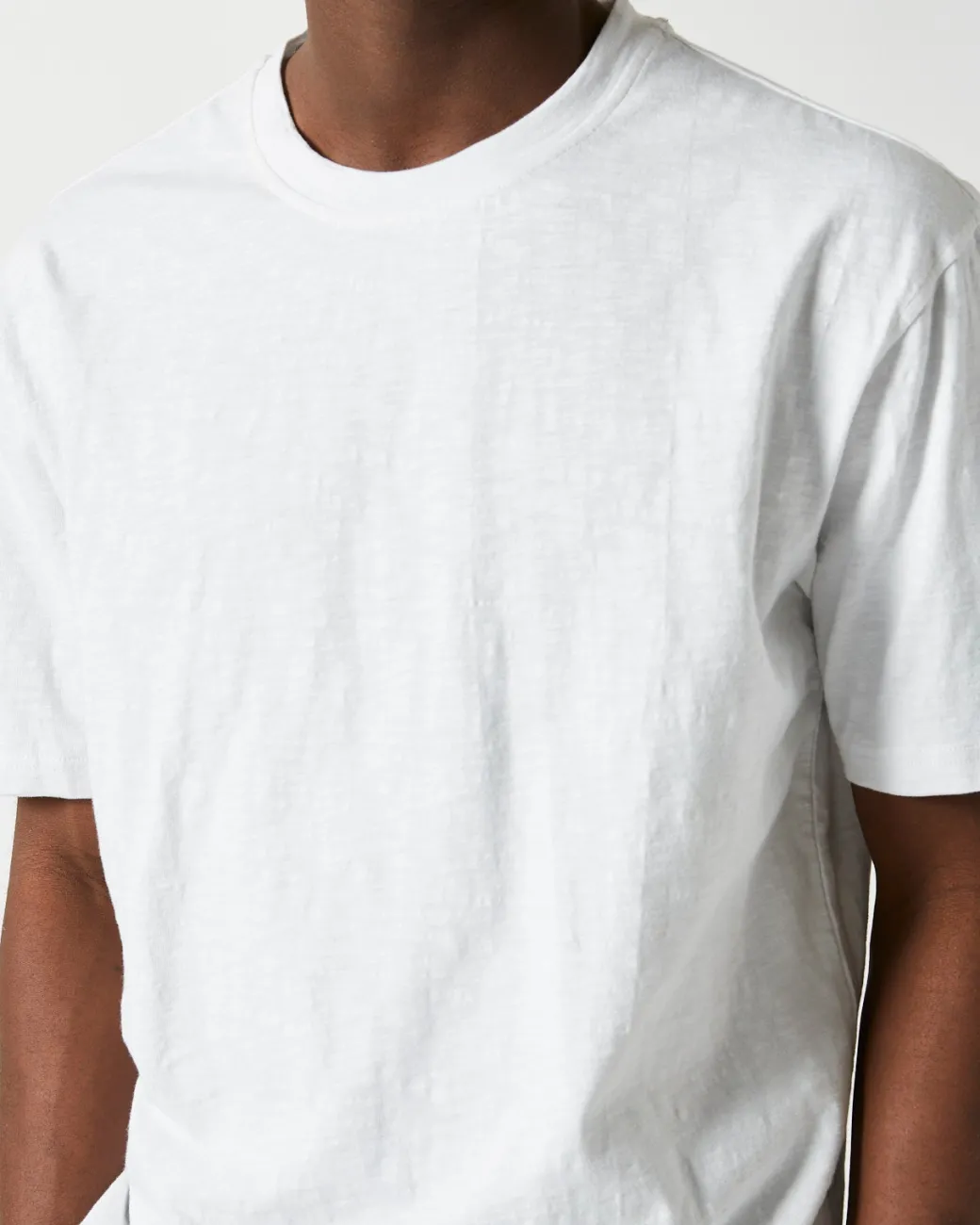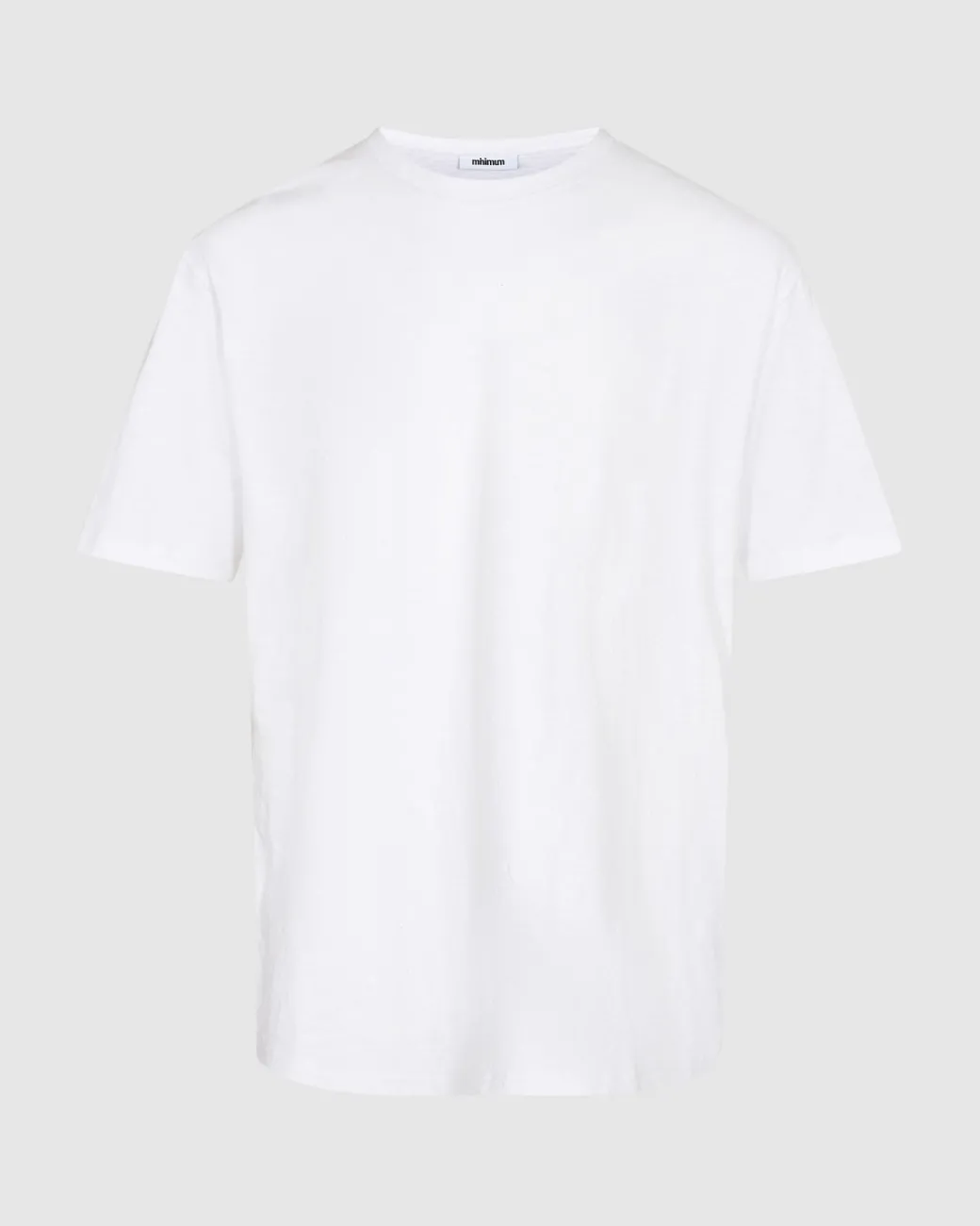 Heon G009 is a short sleeved t-shirt in a slightly mottled quality crafted from 100% organic cotton. The shirt has a slightly loose fit and features dropped shoulders and a crew neck. The model is 187 cm tall and wears a size large.